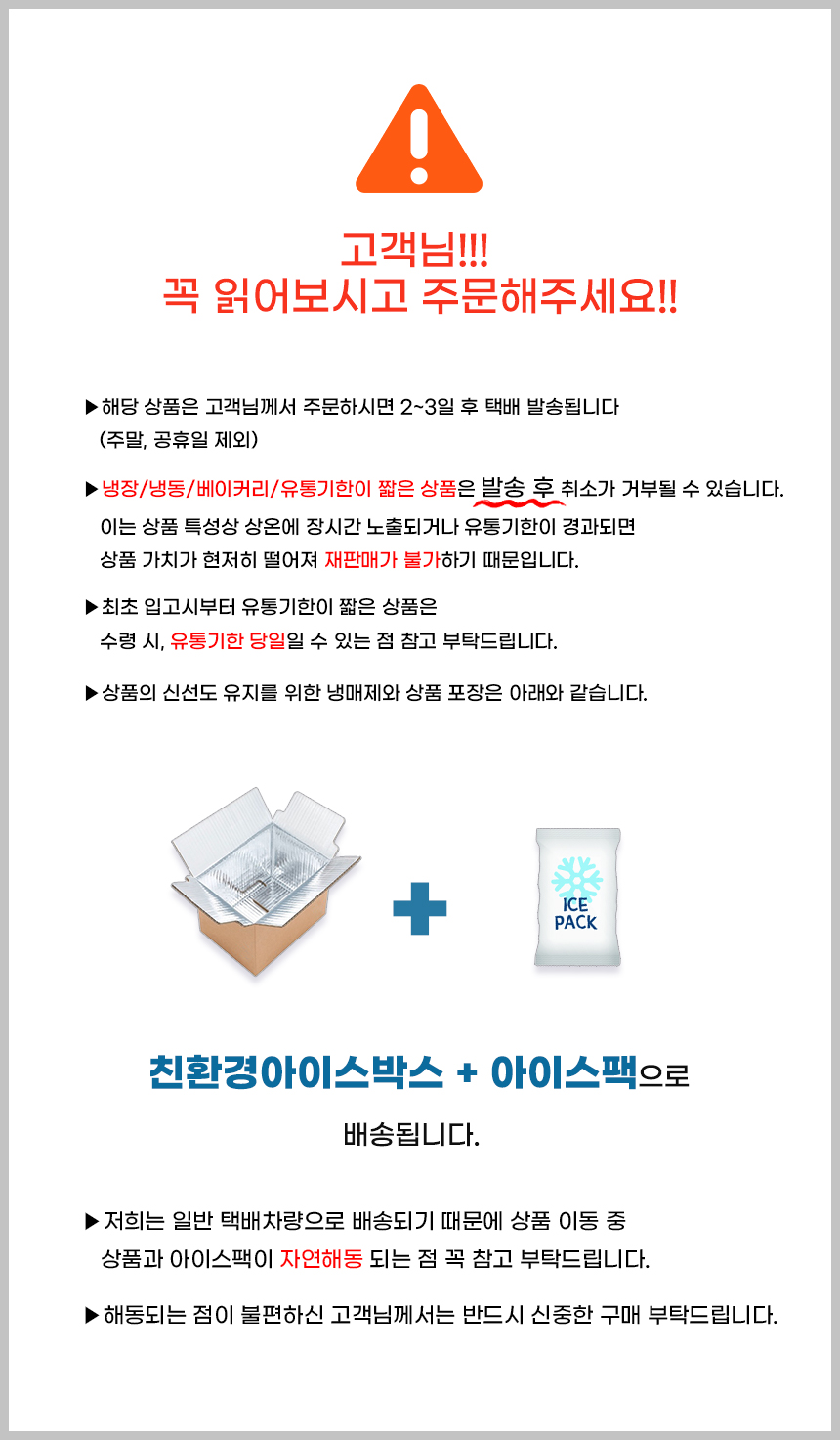 | 계절상품/식품/화장품 | ㆍ신선/냉장/냉동 상품의 단순변심의 경우 ㆍ뷰티 상품 이용 시 트러블(알러지, 붉은 반점, 가려움, 따가움)이 발생하는 경우, |
