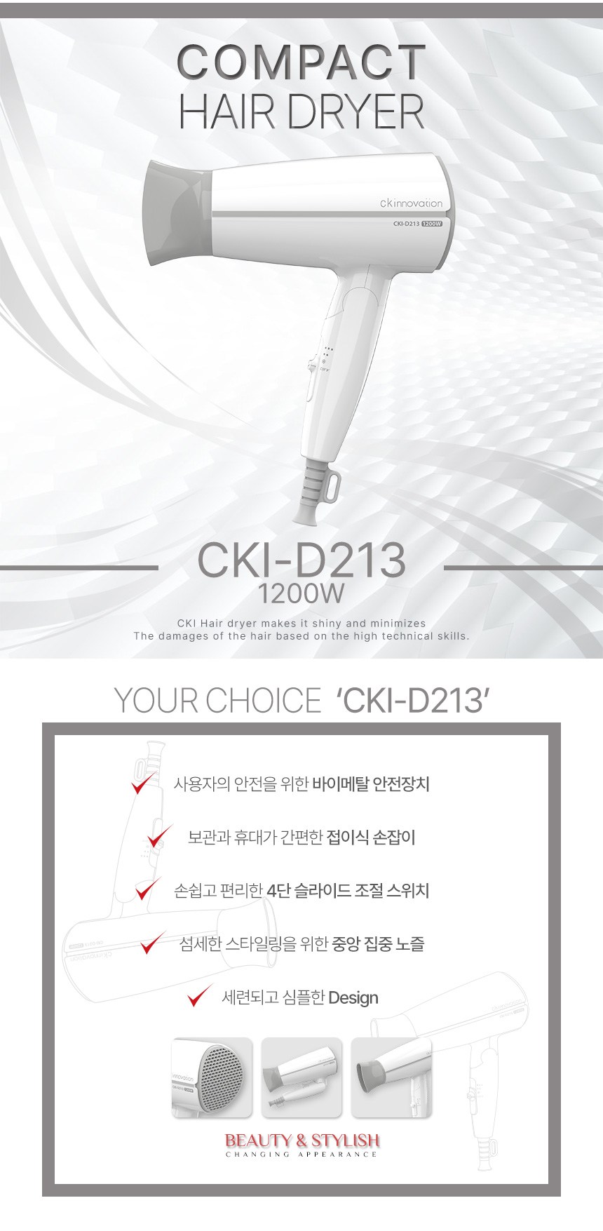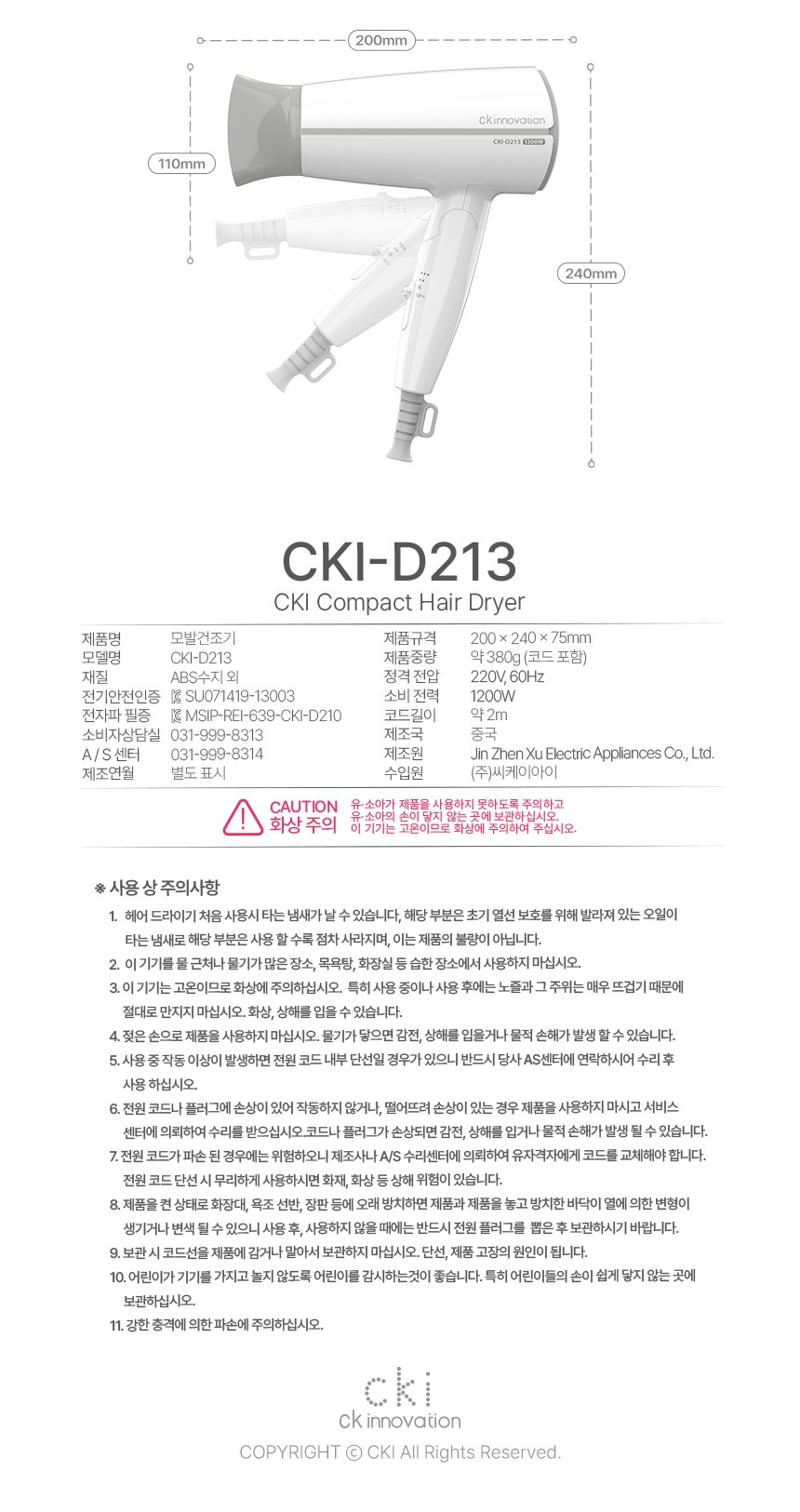 | 품명 및 모델명 | 모발건조기, CKI-D213 화이트 | KC 인증정보 | SU071419-13003, MSIP-REI-639-CKI-D210 |