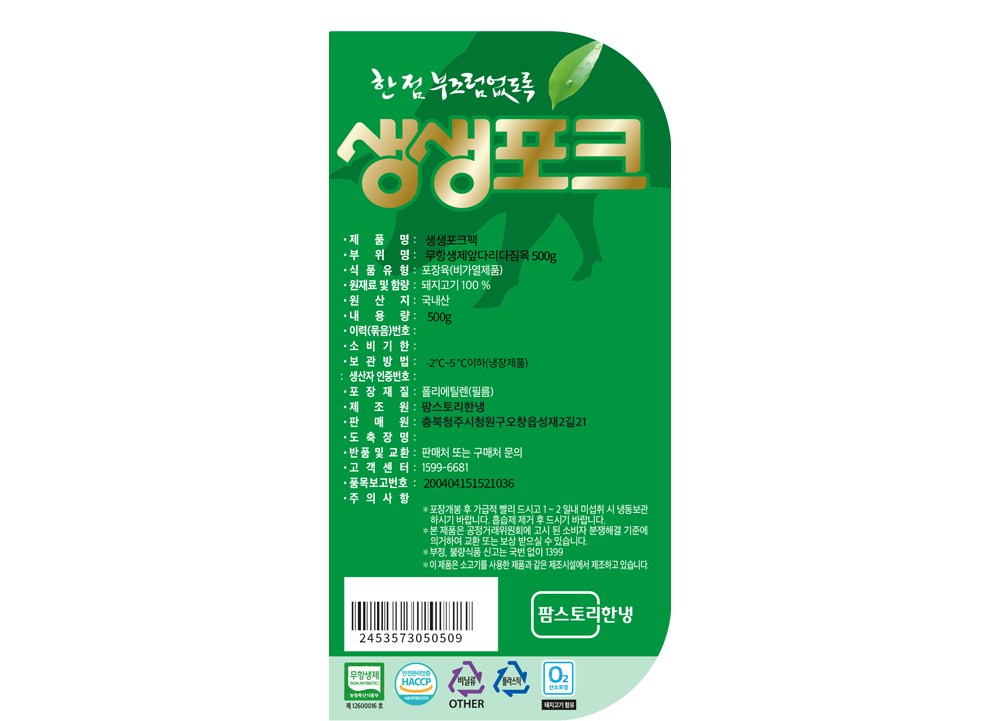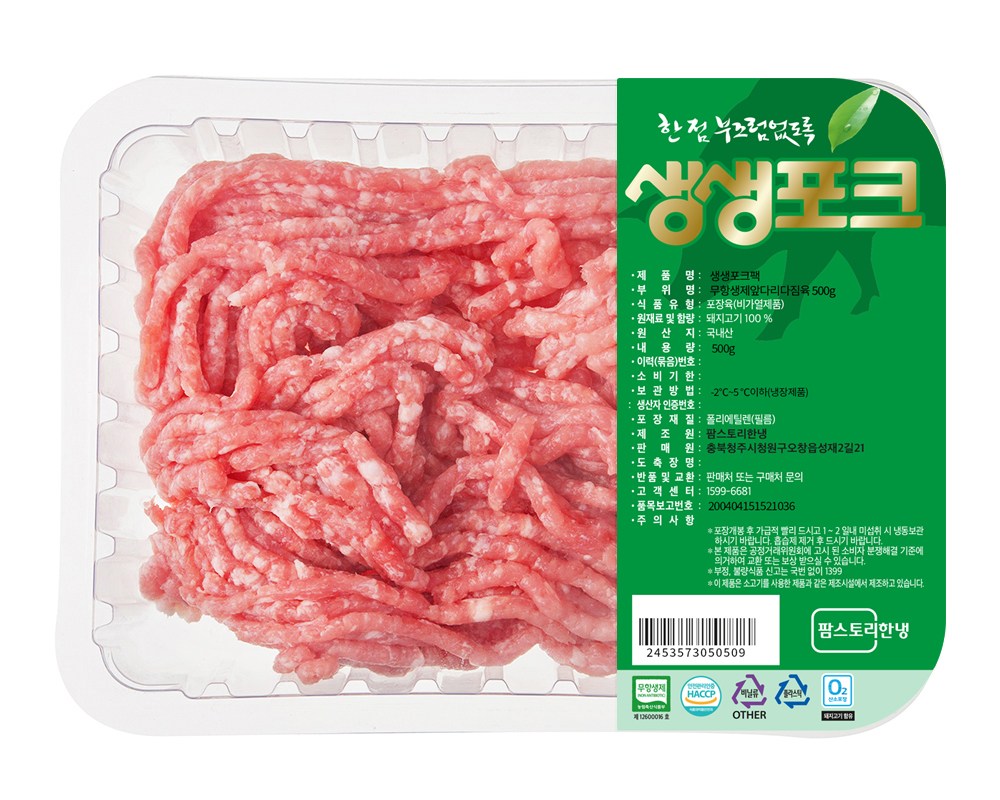 | 품목 또는 명칭 | 생생포크팩 | 포장단위별 내용물의 용량(중량),수량,크기 | 500g x 2팩,1개 |