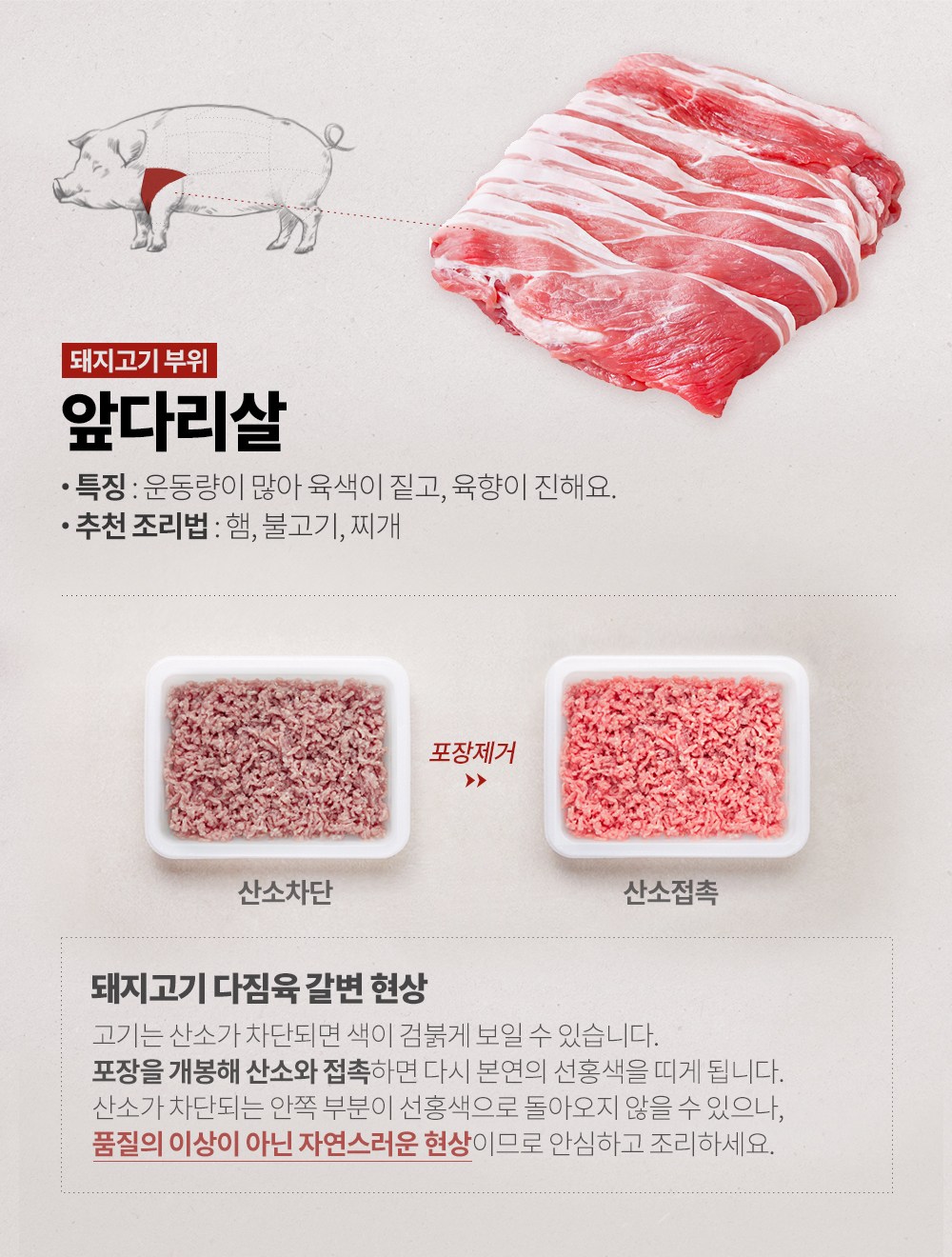 신선도를 유지하기 위해 MAP(Modified Atmospheres Packaging) 기법으로 포장했어요. 용기 내에 산소와 이산화탄소를 채워 고기의 맛과 품질을 유지합니다.