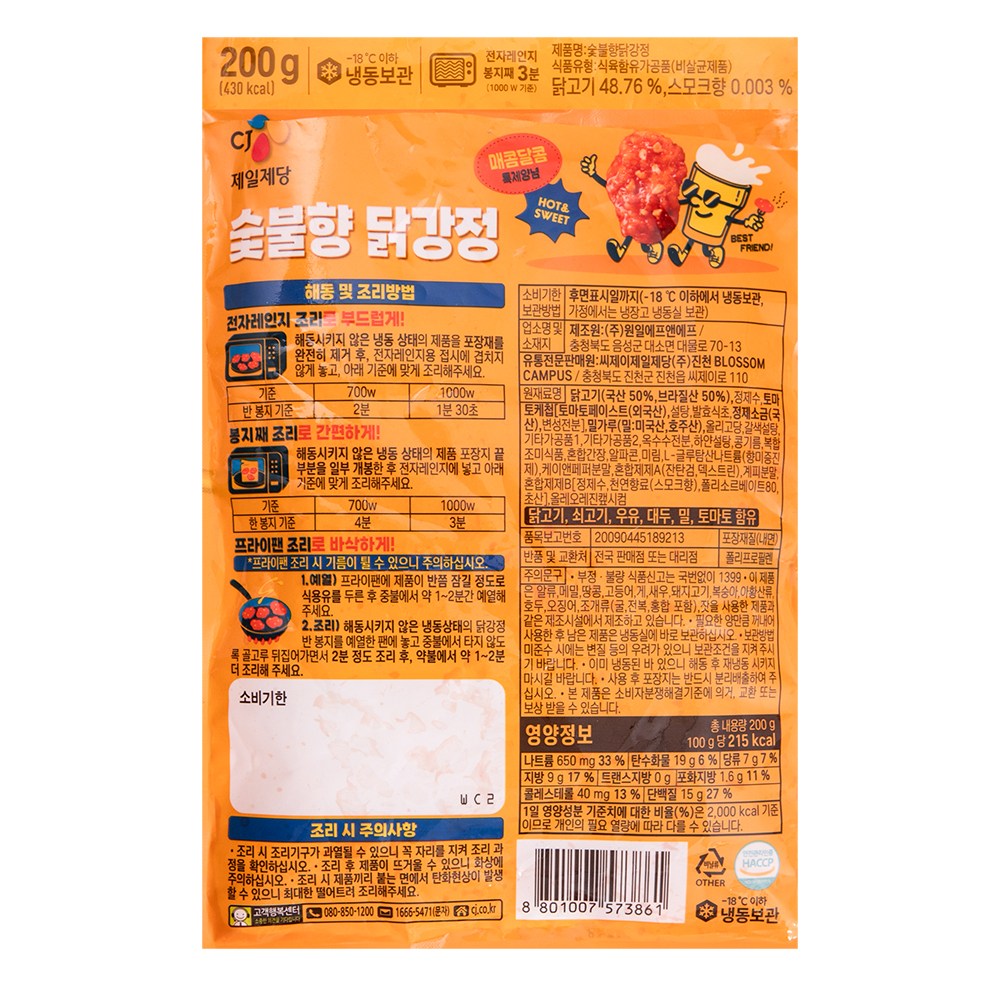 먹기 좋은 크기의 숯불향 닭강정을 소개할게요. 조리한 후, 포크나 젓가락으로 쏙쏙 집어먹기 좋답니다. 한 입 베어 물면 촉촉한 식감 사이로 매콤하면서 달짝지근한 풍미가 퍼지죠. 전자레인지로 봉지째 조리할 수도 있으니, 손쉽게 준비해 즐겨보세요.