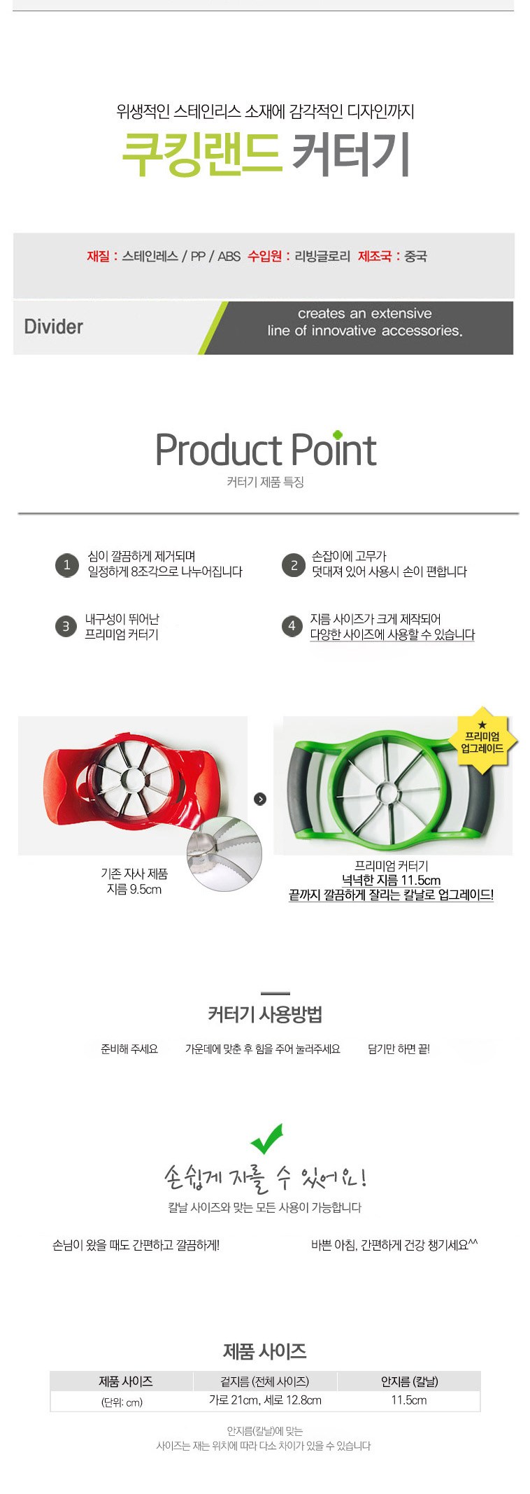 | 품명 및 모델명 | 쿠킹랜드 사과커터기 | 재질 | 핸들(PP+RUBBER), 칼날(스테인리스스틸), 몸체(ABS) |