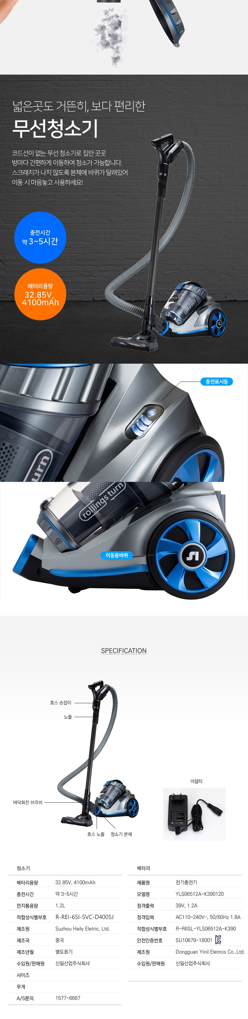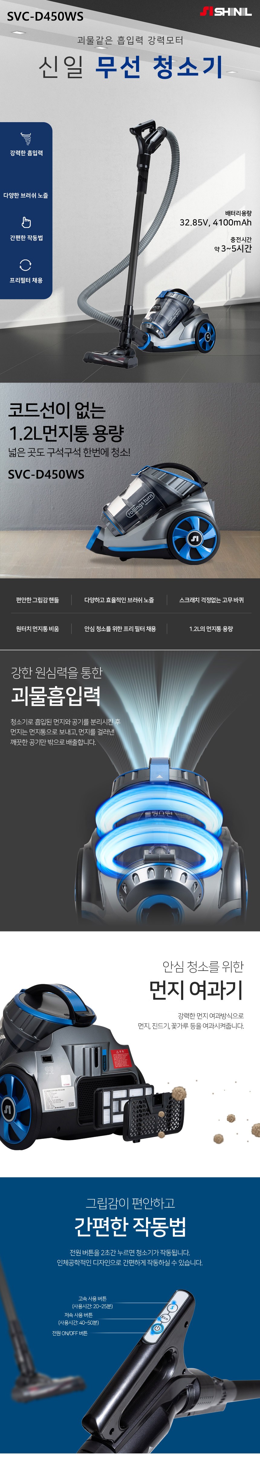 | 품명 및 모델명 | 진공청소기/SVC-D450WS | KC 인증정보 | 본품 : R-REI-6SI-SVC-D400SJ / 어댑터 : SU10679-18001 |