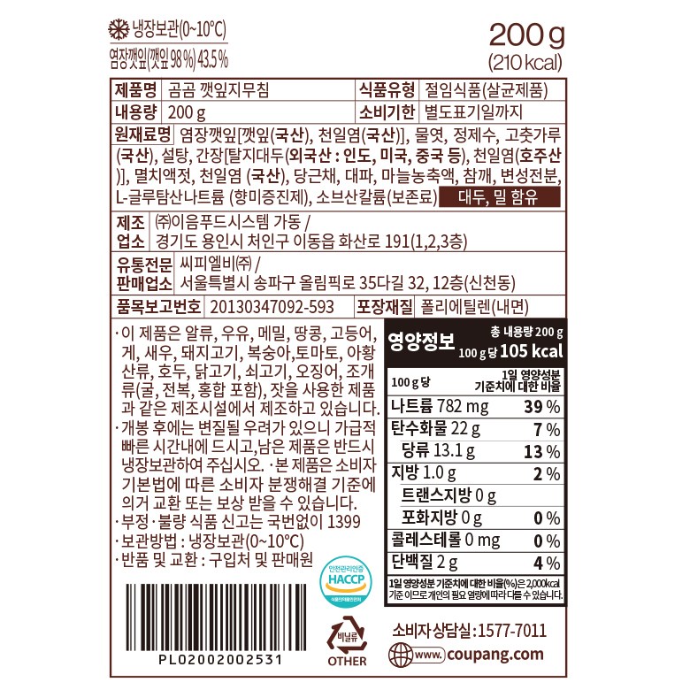 | 제품명 | 곰곰 깻잎지무침 | 식품의 유형 | 절임식품 |