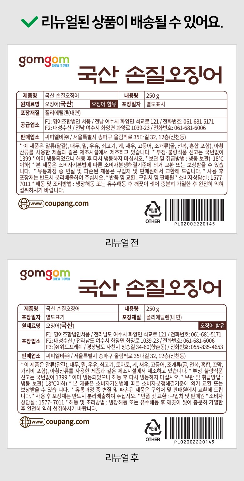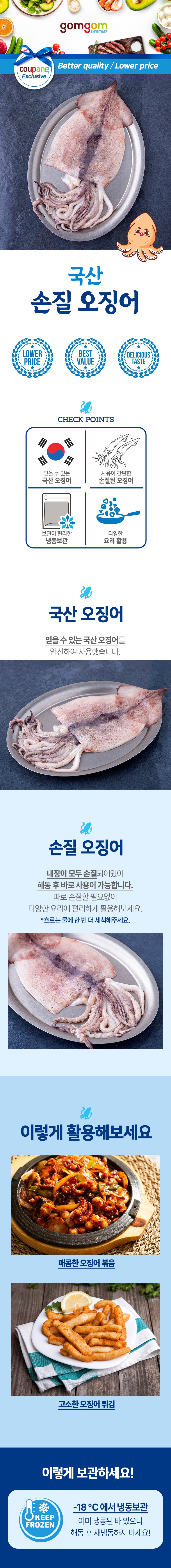 | 품목 또는 명칭 | 국산 손질오징어 | 포장단위별 내용물의 용량(중량),수량,크기 | 250g, 1개 |