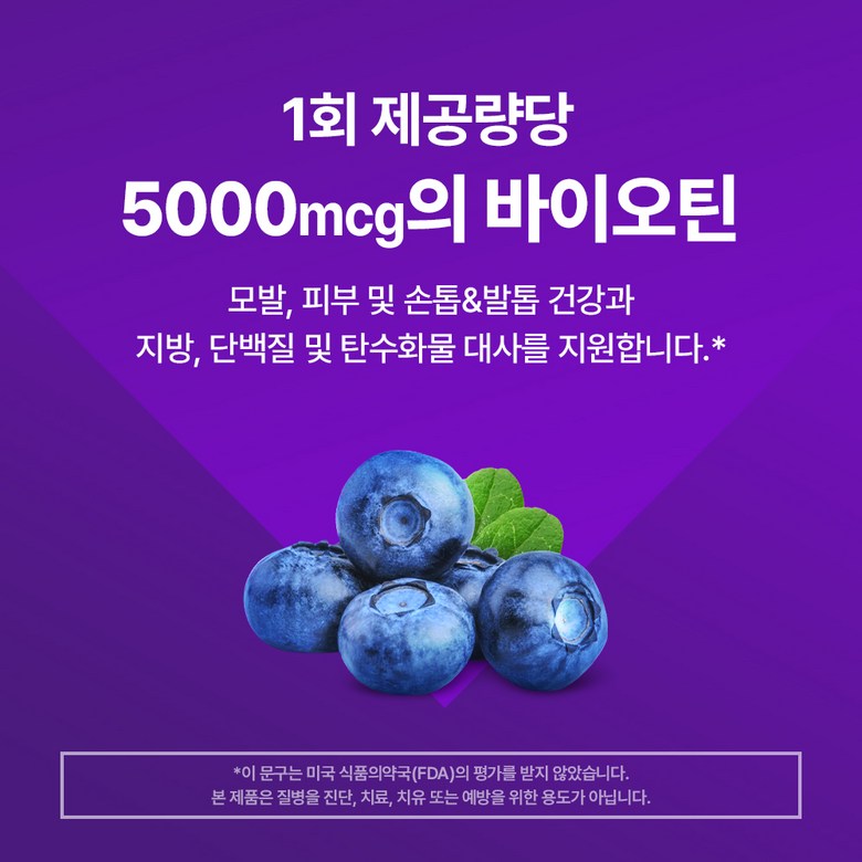 | 제품명 | 비타퓨전 비오틴 엑스트라 스트렝스 5000mcg 블루베리 구미 | 식품의 유형 | 기타가공식품 |