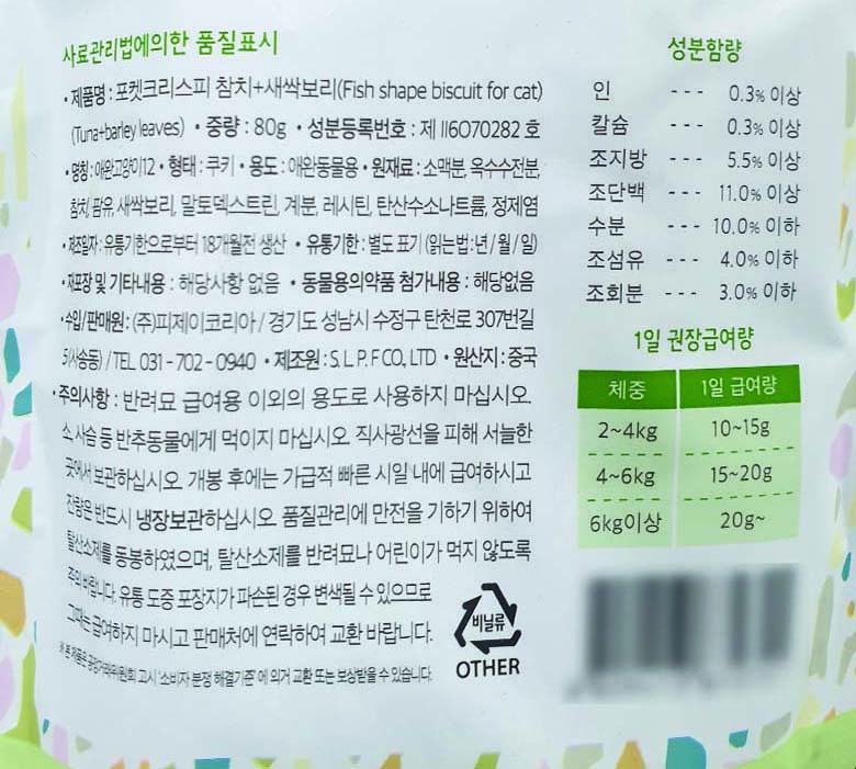 | 품명 및 모델명 | 포켓크리스피 참치+새싹보리 | 인증/허가 사항 | 사료관리법에 따른 성분등록번호 : 컨텐츠 참조 |