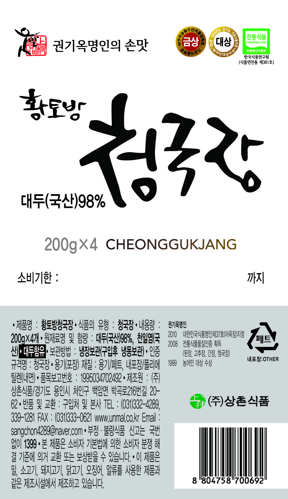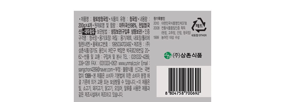 | 제품명 | 황토방 청국장 | 식품의 유형 | 청국장 |