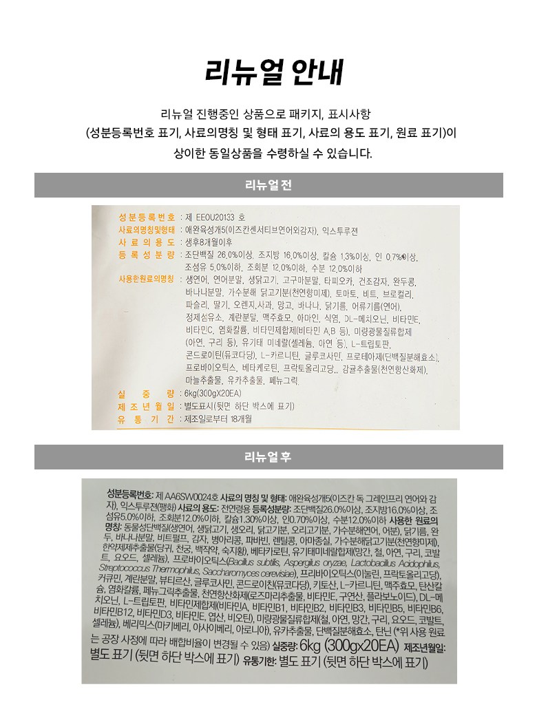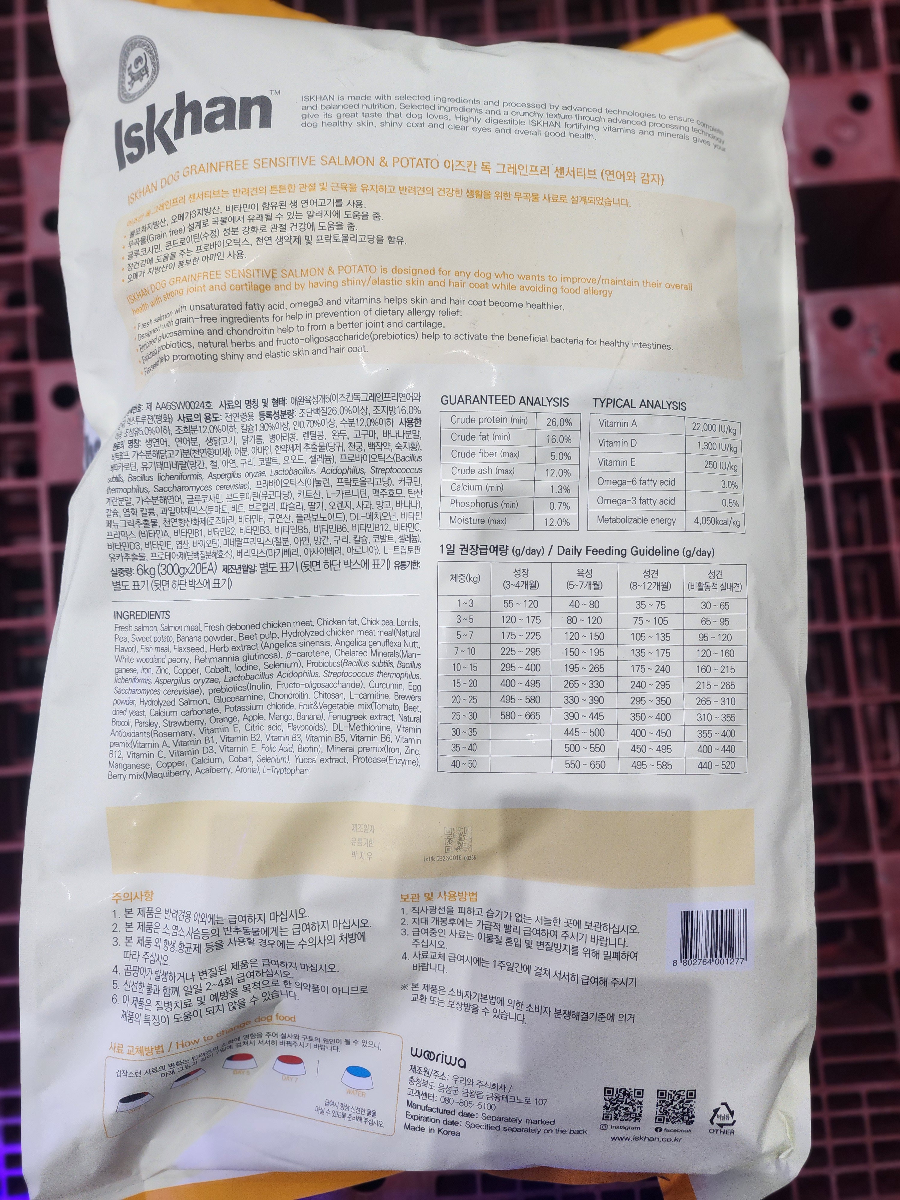 | 품명 및 모델명 | 이즈칸 독 그레인프리 연어와감자 | 인증/허가 사항 | 사료관리법에 따른 성분등록번호 : 컨텐츠 참조 |
