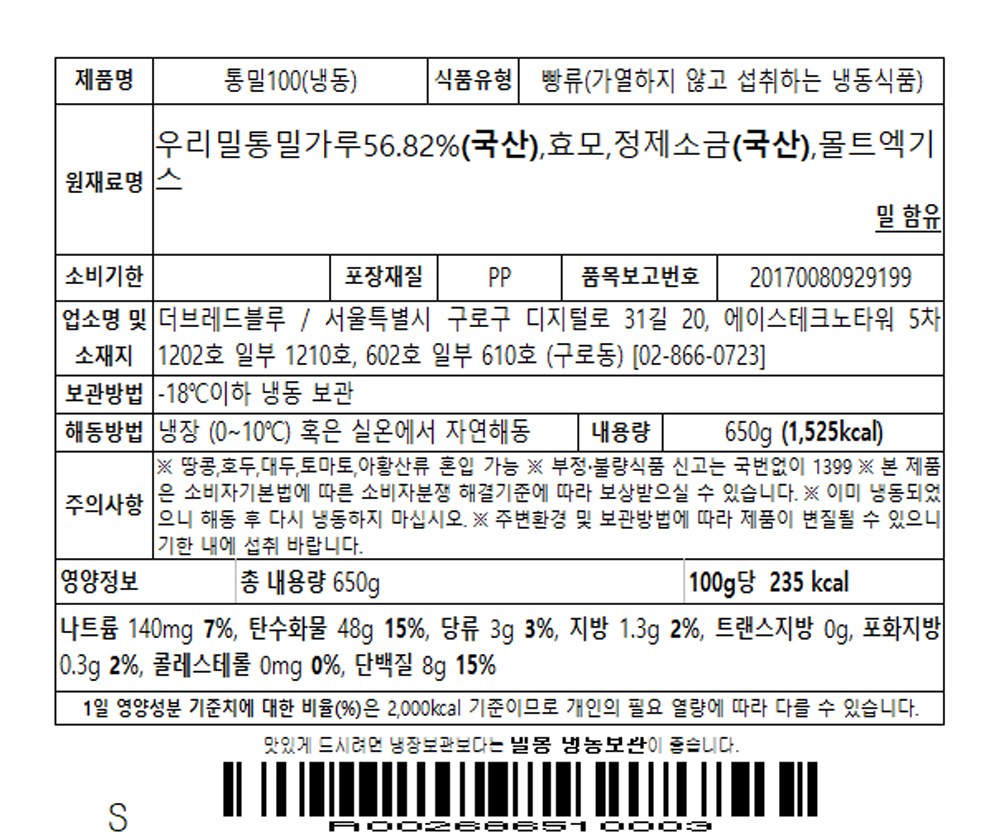 | 제품명 | 통밀100(냉동) | 식품의 유형 | 컨텐츠 참조 |