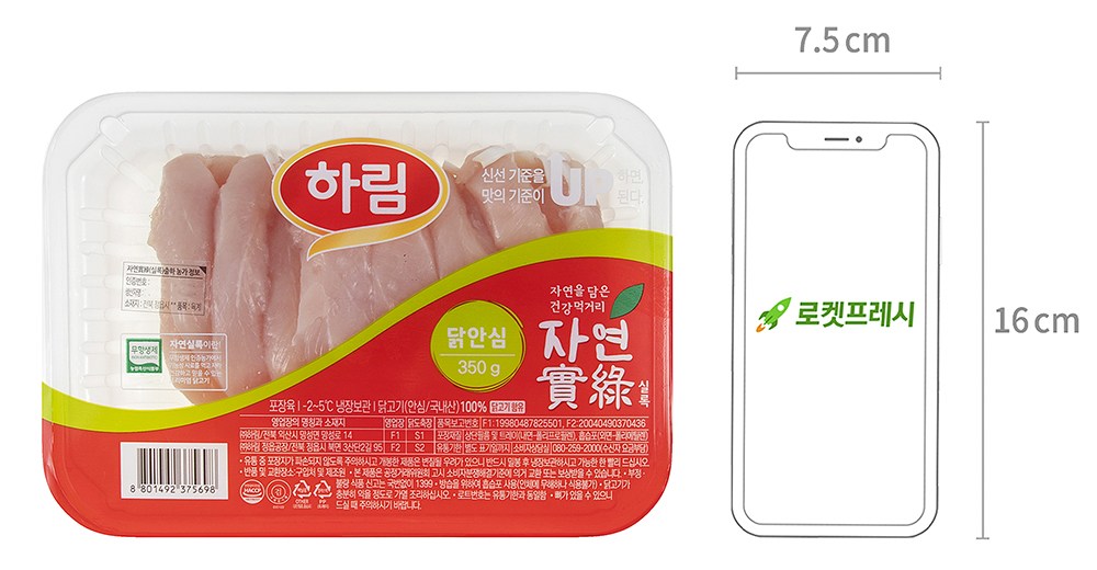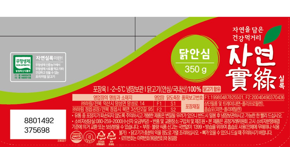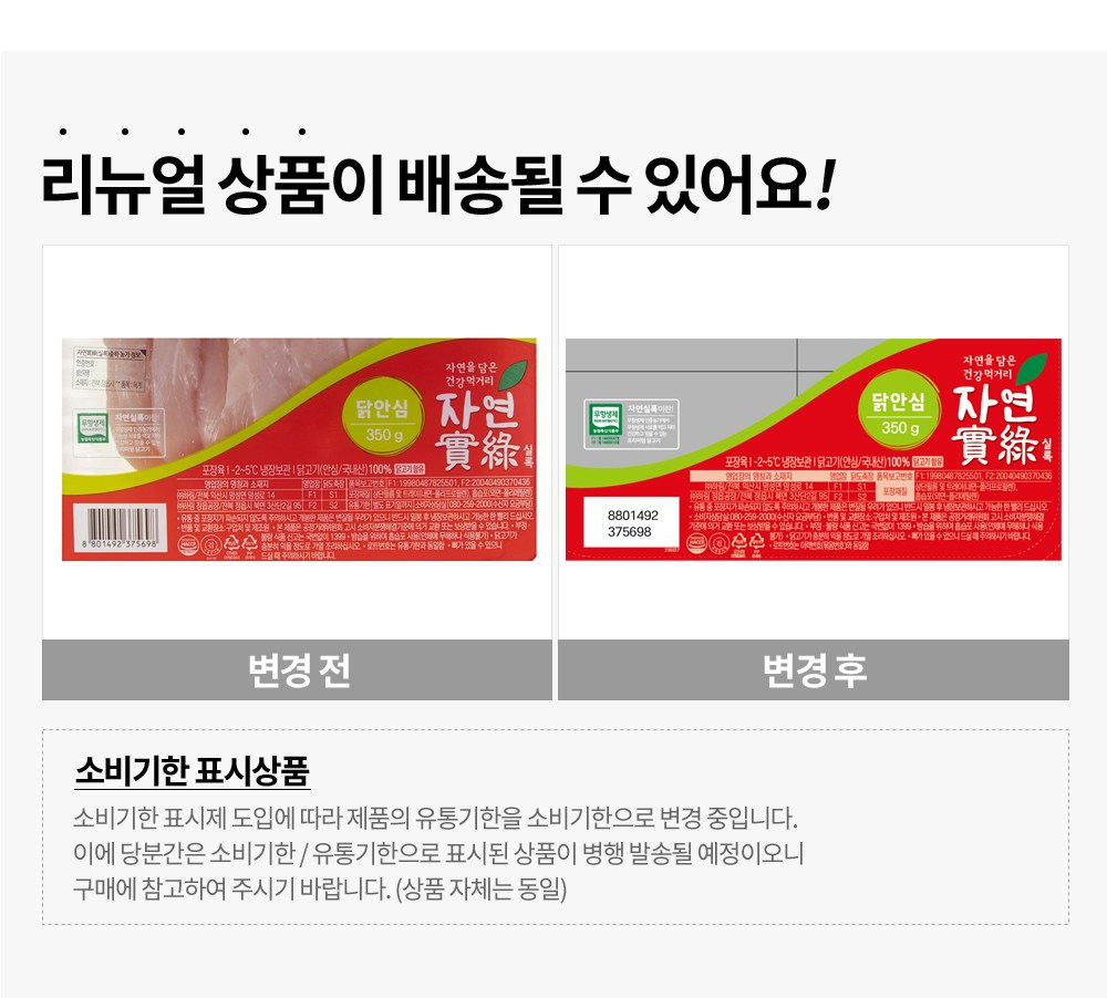 | 품목 또는 명칭 | 자연실록 닭안심 | 포장단위별 내용물의 용량(중량),수량,크기 | 350g x 10팩 |