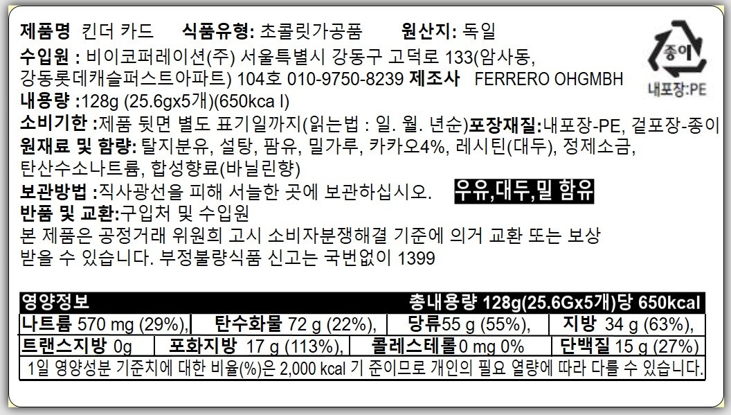 | 제품명 | 킨더 카즈 초콜릿 | 식품의 유형 | 초콜릿가공품 |