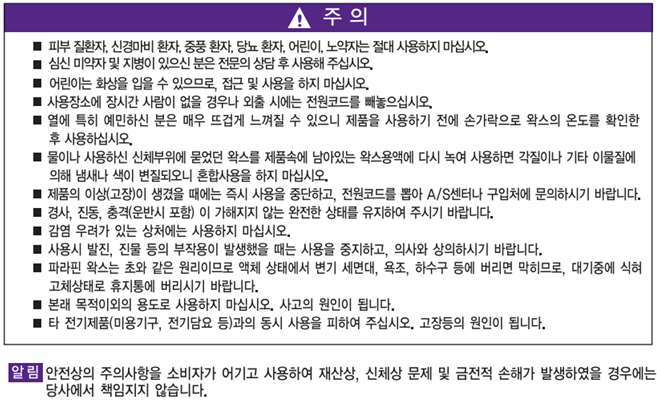 | 품명 및 모델명 | 파라핀 욕조 / IPB-9000 | 허가∙인증∙신고번호 (의료기기법에 따른 허가∙인증∙신고 대상 의료기기에 한함) | 품목허가번호: 제인 12-2 호 / 광고심의번호: 42024-I10-47-4423 |