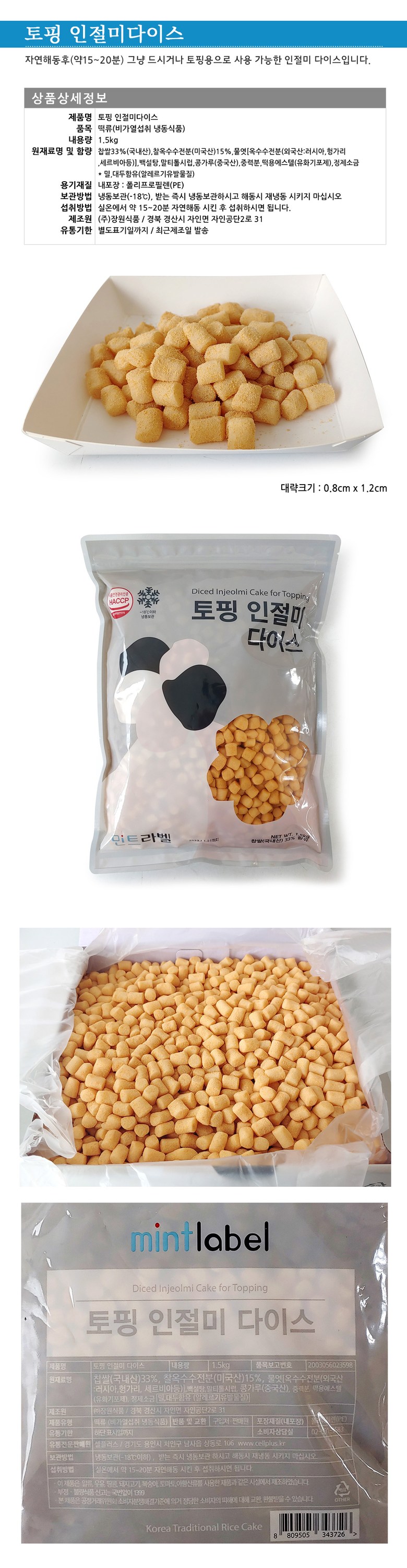 | 제품명 | 토핑 인절미 다이스 | 식품의 유형 | 떡류(비가열섭취 냉동식품) |