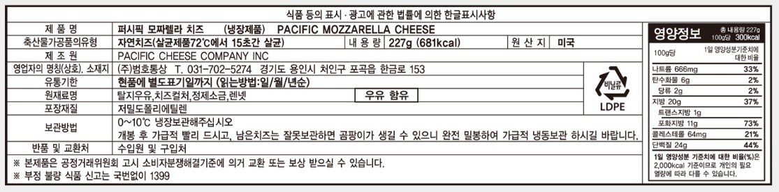| 제품명 | 퍼시픽 모짜렐라 치즈 | 식품의 유형 | 자연치즈 |