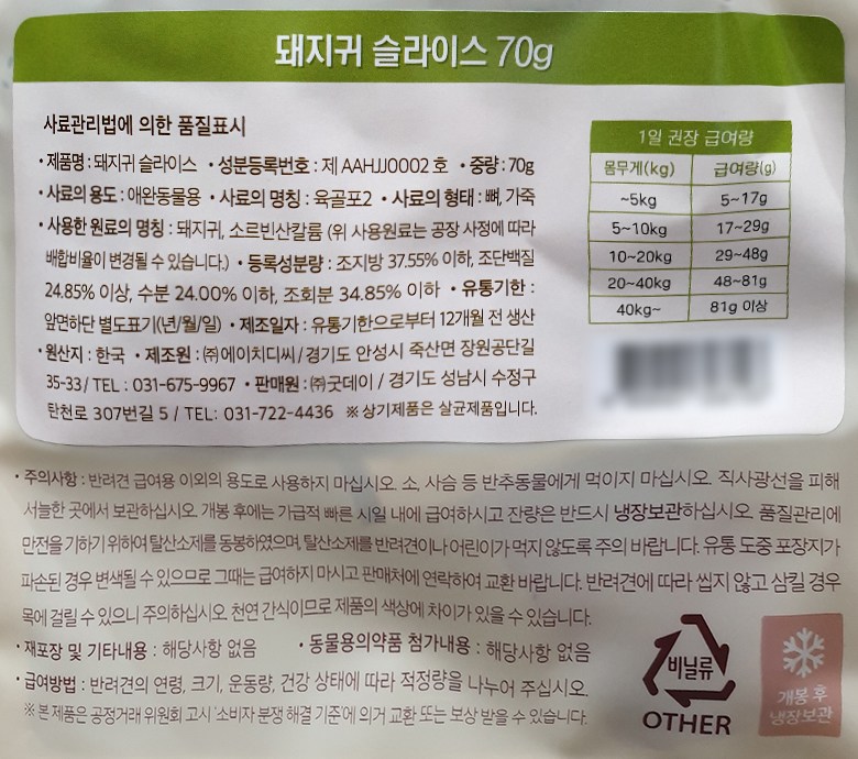 | 품명 및 모델명 | 돼지귀 슬라이스 | 인증/허가 사항 | 사료관리법에 따른 성분등록번호 : 컨텐츠 참조 |