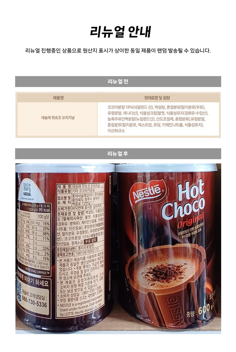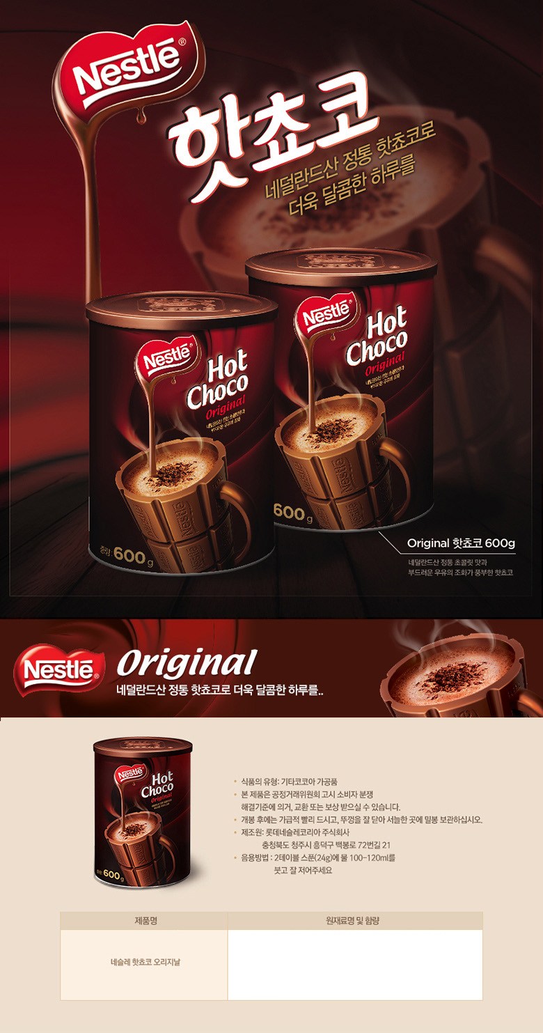 | 제품명 | 네슬레 핫쵸코 오리지날 | 식품의 유형 | 기타 코코아가공품 |