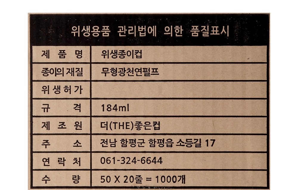 | 품명 및 모델명 | (위생용품) 위생 종이컵 | 인증/허가 사항 | 해당없음 |