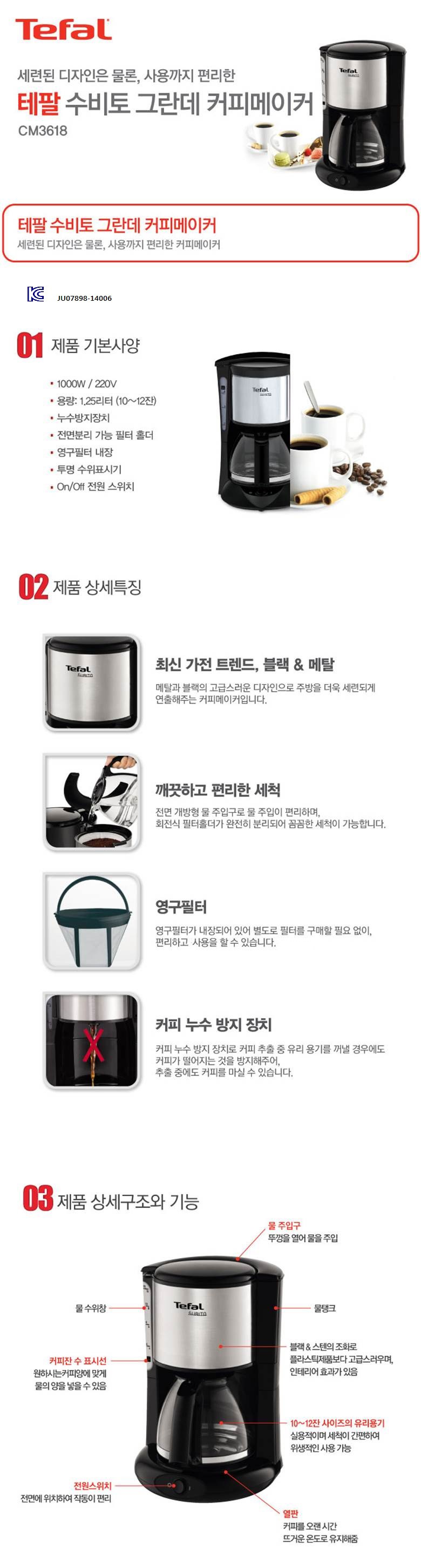 | 품명 및 모델명 | 테팔 수비토 그란데 커피메이커 / CM3618 | KC 인증정보 | JU07898-14006 |