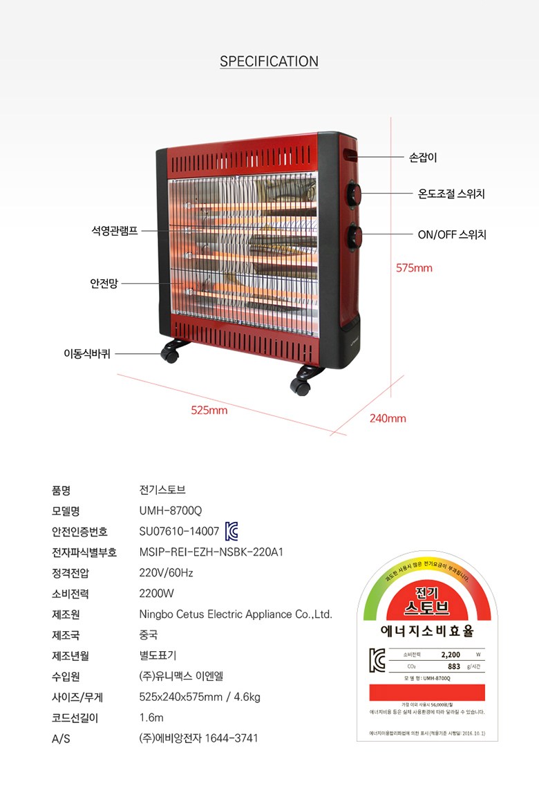 | 품명 및 모델명 | 전기스토브 UMH-8700Q | KC 인증정보 | SU07610-14007C, MSIP-REI-EZH-NSBK-220A1 |
