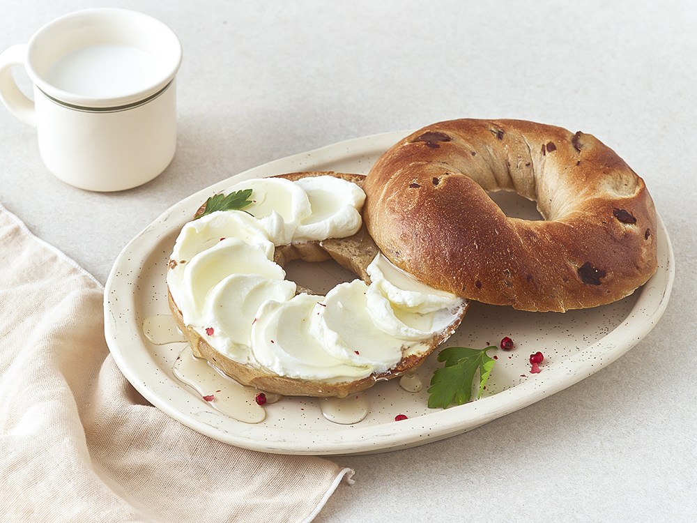 2. 베이글 한 쪽에 소스를 발라주세요.