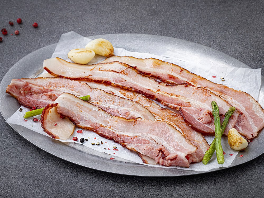 쫄깃하면서도 부드러운 식감으로 입맛을 사로잡는 베이컨이에요. 돼지고기 삼겹살과 천일염 등을 사용해 고소하고 짭조름한 감칠맛이 일품이지요. 노릇노릇하게 구워내면 바삭하게 즐기실 수 있답니다. 볶음밥, 토스트, 파스타 등 다양한 요리에 활용해보세요.