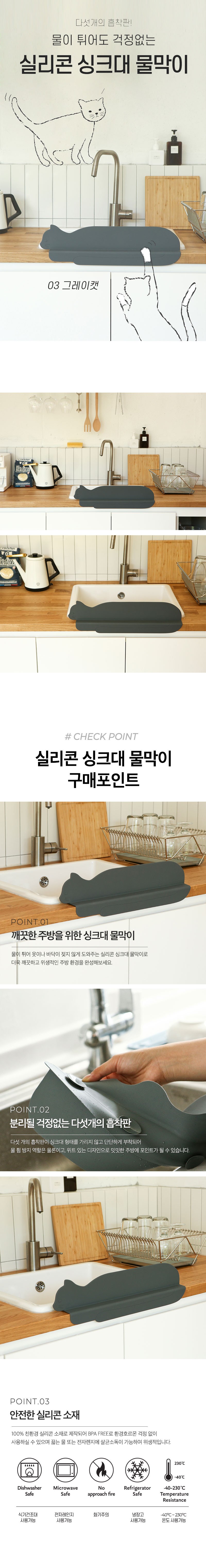 | 품명 및 모델명 | 실리콘 싱크대 물막이 _ 03 그레이캣 | 재질 | 실리콘 |