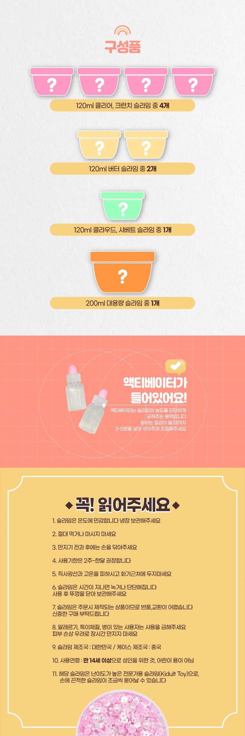 | 제조국(원산지) | 슬라임- 대한민국 / 슬라임통- 중국 | 제조자(수입자) | 아트니즘 |