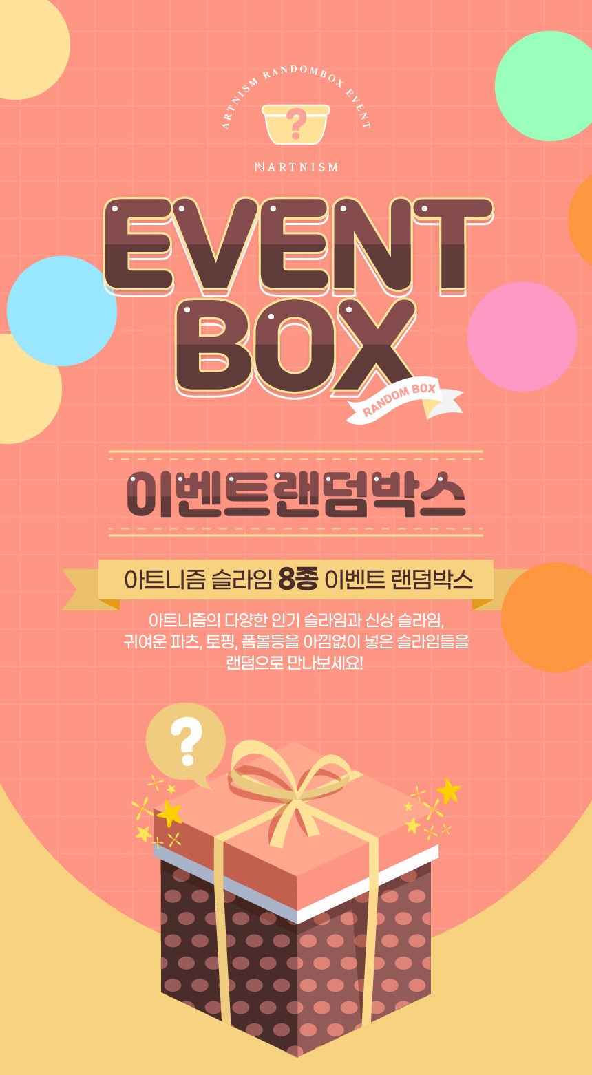 | 품명 및 모델명 | 아트니즘 수제 슬라임 이벤트박스 | 인증/허가 사항 | 해당없음(14세 이상) |