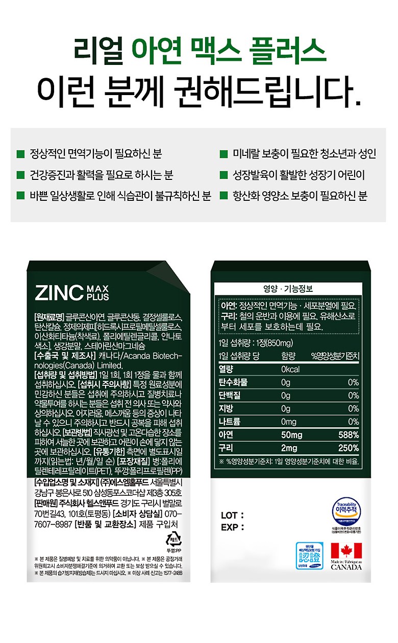 | 제품명 | 더리얼 아연 맥스 플러스 | 제조업소의 명칭과 소재지 | 컨텐츠참조 |