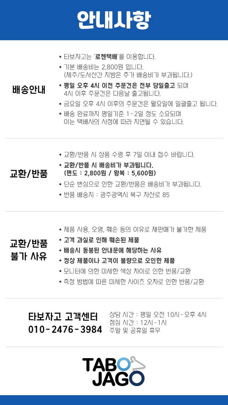 - ㆍ모니터 해상도의 차이로 인해 색상이나 이미지가 실제와 달라, 고객이 단순 변심으로 교환/반품을 무료로 요청하는 경우