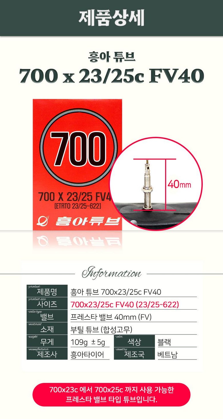 | 품명 및 모델명 | 흥아 자전거 튜브 700x23/25 FV40 | KC 인증정보 | KC 인증 대상 아님 |