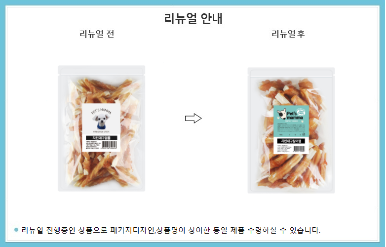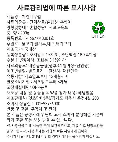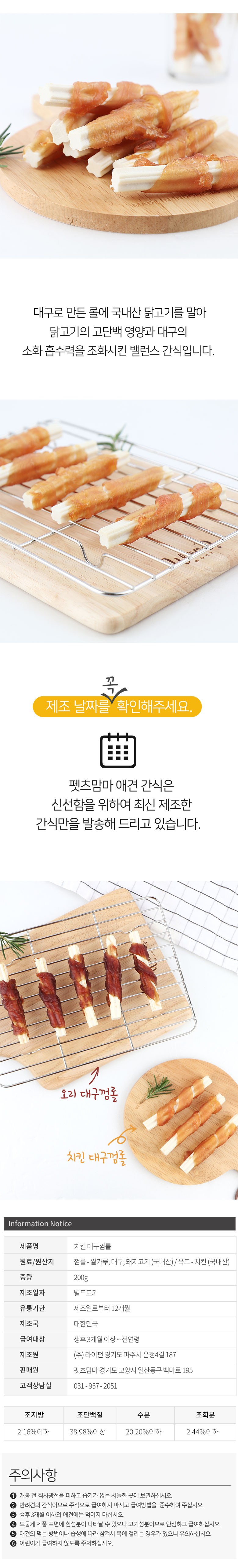 | 품명 및 모델명 | 치킨대구껌 | 인증/허가 사항 | 사료관리법에 따른 성분등록번호 : 컨텐츠 참조 |