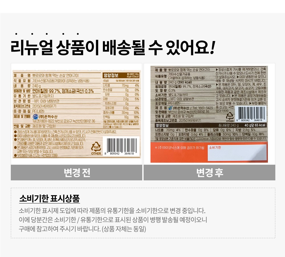 | 생산자 및 소재지 | 은하수산 / 부산시 강서구 녹산산단381로36 | 소비기한 또는 품질유지기한 | 소비기한(또는 유통기한) : 2027년 12월 21일 이거나 그 이후인 상품 |