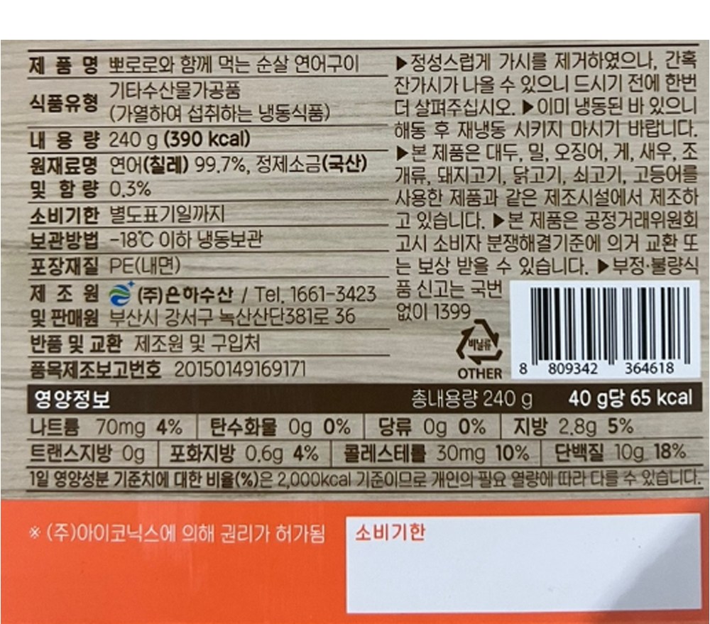 | 제품명 | 뽀로로와 함께먹는 순살 연어구이 | 식품의 유형 | 기타수산물가공품 |