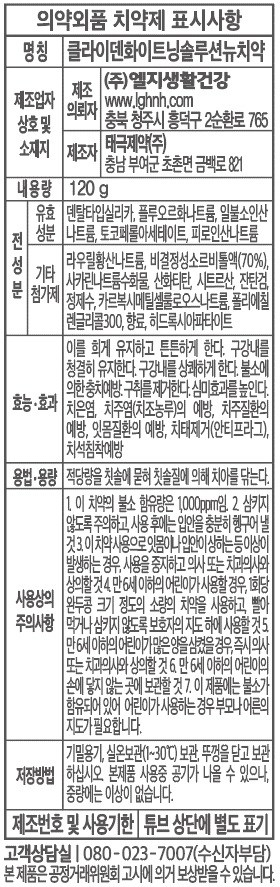 | 품명 및 모델명 | 클라이덴화이트닝솔루션뉴치약 | 인증/허가 사항 | 의약외품 |