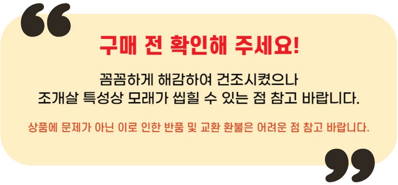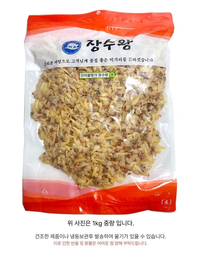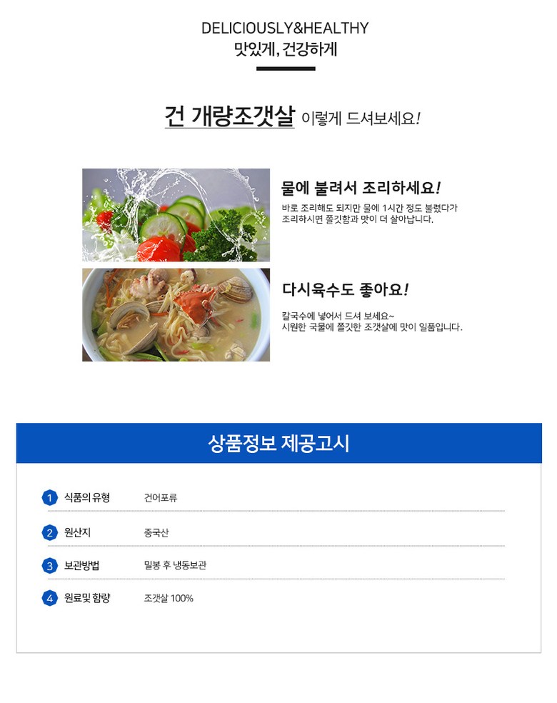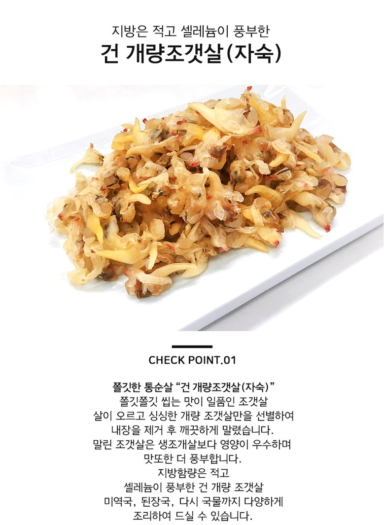 | 품목 또는 명칭 | 건개량조갯살 | 포장단위별 내용물의 용량(중량),수량,크기 | 상품 상세페이지 참조 |