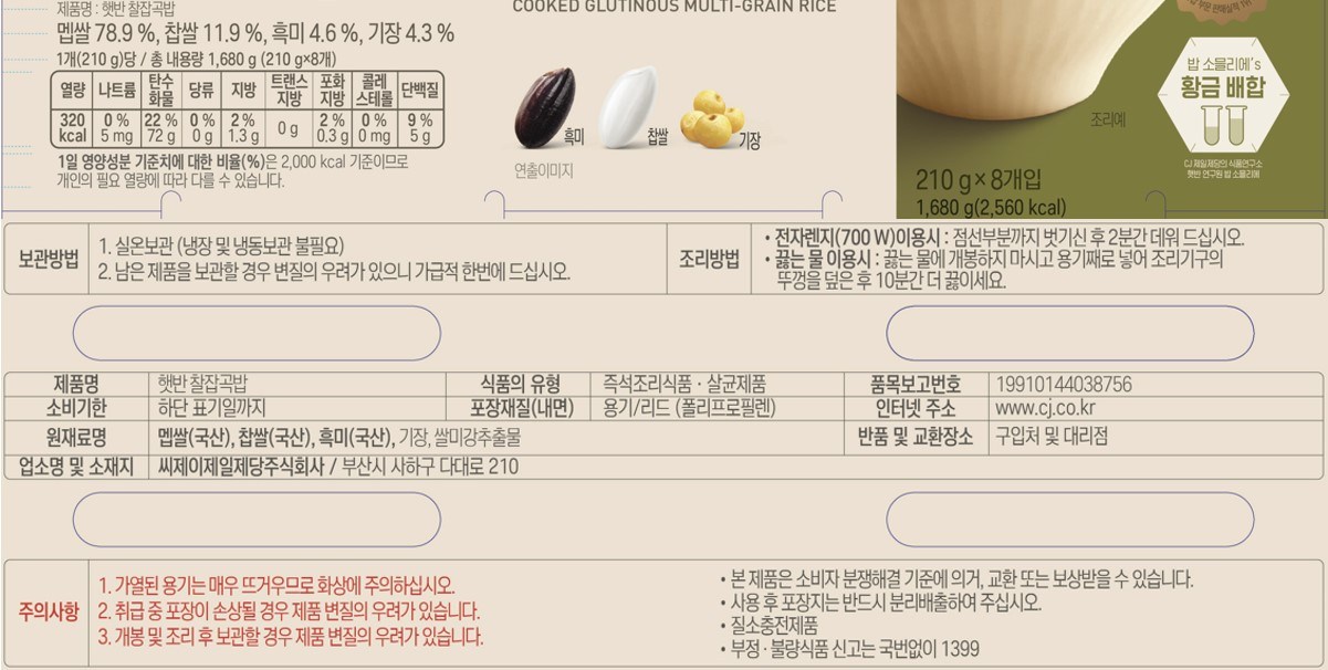 | 제품명 | 햇반 찰잡곡밥 | 식품의 유형 | 컨텐츠 참조 |