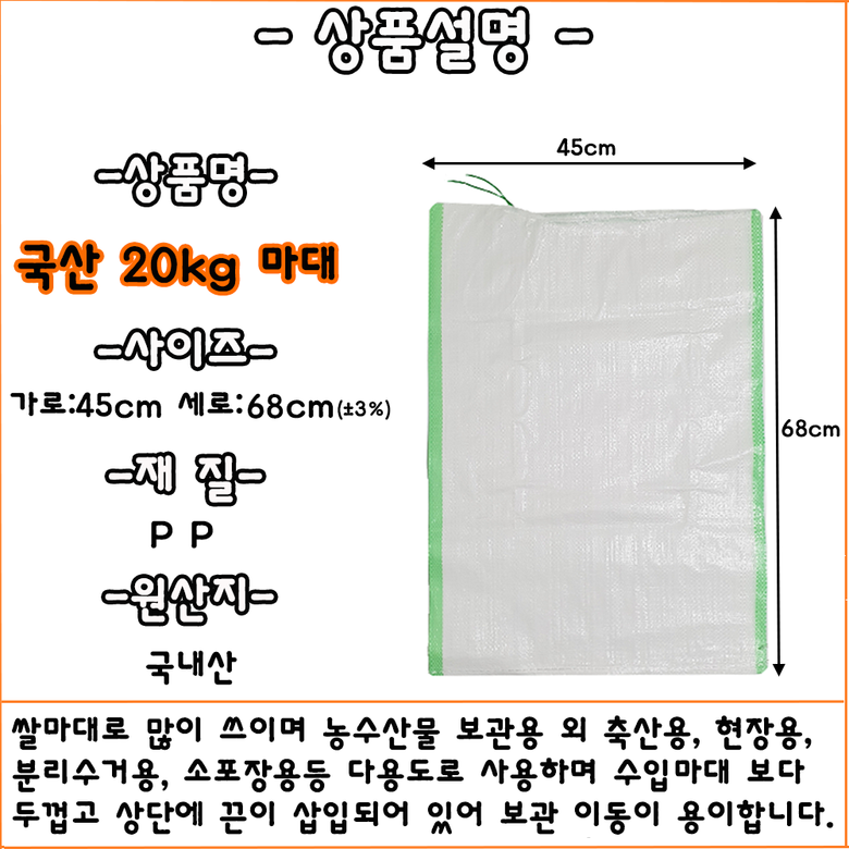 | 품명 및 모델명 | 마대 포대 국산신품 국산마대 자루 20KG쌀포대 20KG쌀자루 | 인증/허가 사항 | Q마크 |