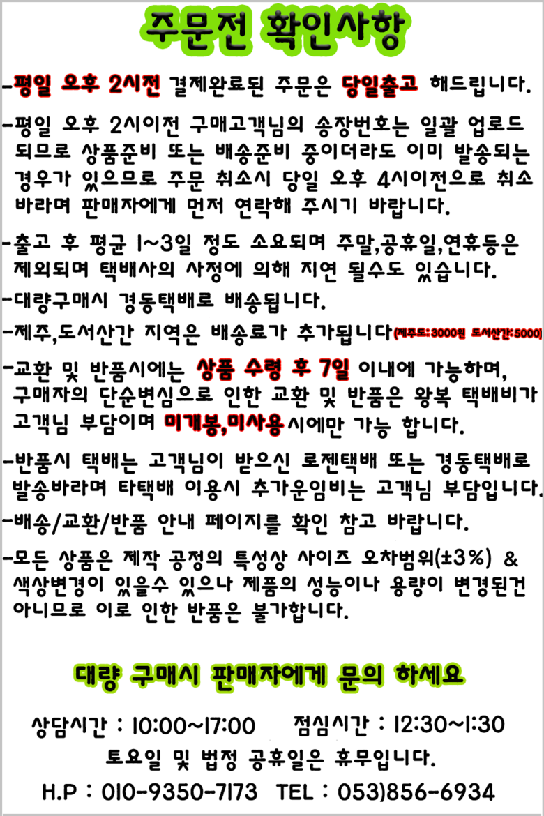 - ㆍ교환/반품에 관한 일반적인 사항은 판매자가 제시사항보다 관계법령이 우선합니다.