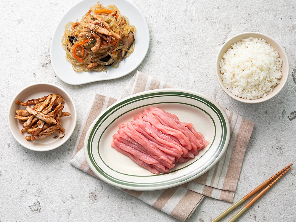쫄깃한 당면, 신선한 채소와 고소한 고기 등 다양한 식재료들이 어우러져 풍성한 맛과 식감을 자랑하는 잡채. 돼지고기 등심으로 잡채의 풍미를 한껏 살려보세요. 바로 요리할 수 있도록 가늘고 길게 썬 냉장육을 담아 준비했어요. 농림축산식품부로부터 무항생제 인증까지 받아 더욱 믿고 드실 수 있답니다. 연한 육질에 담백한 맛을 품은 등심은 흠잡을 데 없는 완벽한 잡채를 만들어줄 거예요.