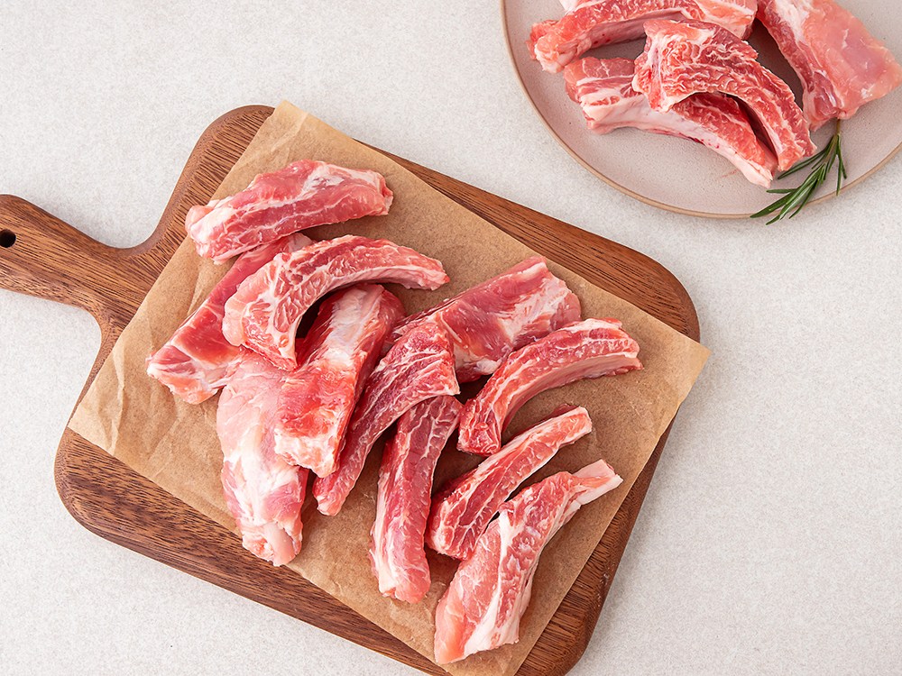 부드러우면서도 쫄깃한 식감이 좋은 부위, 등갈비예요. 진한 육즙과 고소한 감칠맛이 일품이지요. 요리하기 좋게 정형되어 있어 간편하게 활용할 수 있답니다. 양념을 발라 굽거나 뜨끈하게 쪄서 즐겨보세요. 살코기를 발라먹는 재미가 있어 자꾸만 손이 갈 거예요.