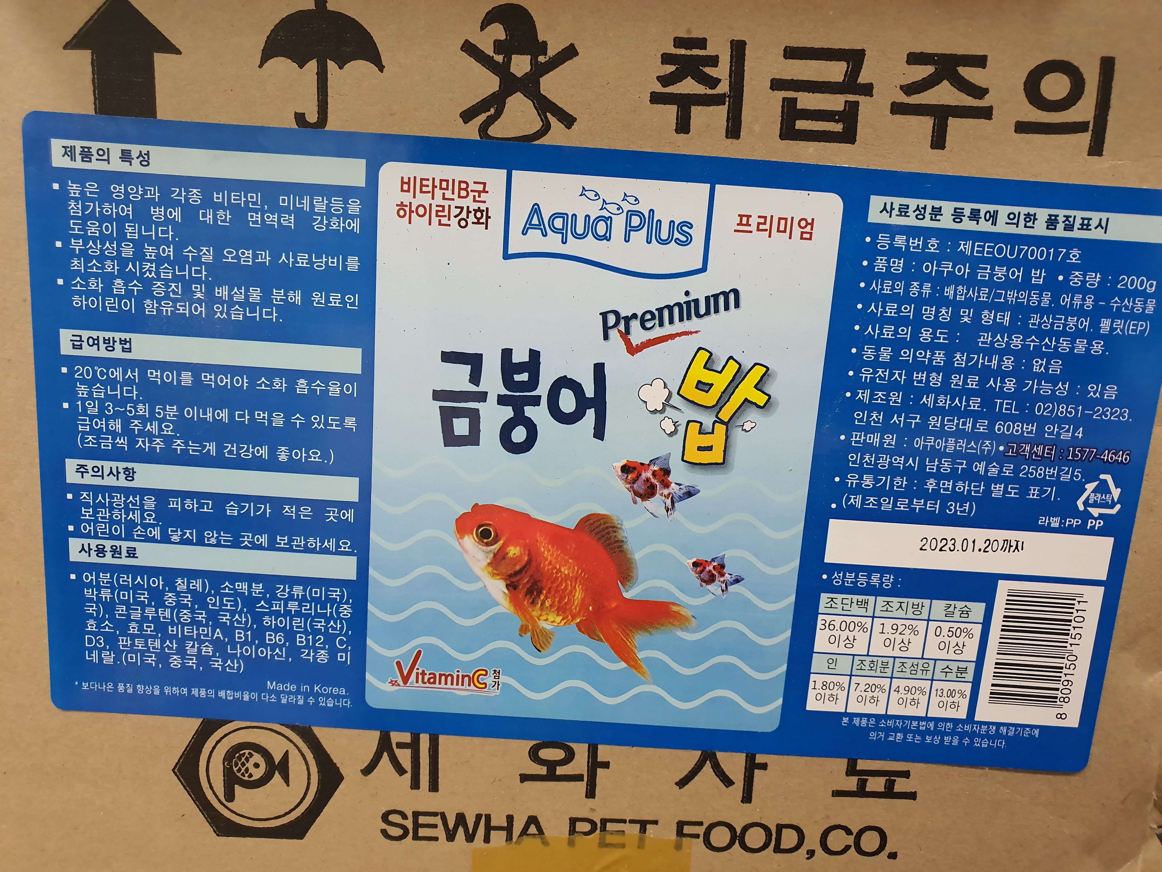| 품명 및 모델명 | 아쿠아 금붕어 밥 | 인증/허가 사항 | 사료관리법에 따른 성분등록번호 : 컨텐츠 참조 |
