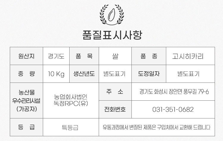 | 품목 또는 명칭 | 독정RPC 햇살드리 고시히카리 쌀 경기미 | 포장단위별 내용물의 용량(중량),수량,크기 | 10kg, 1개 |