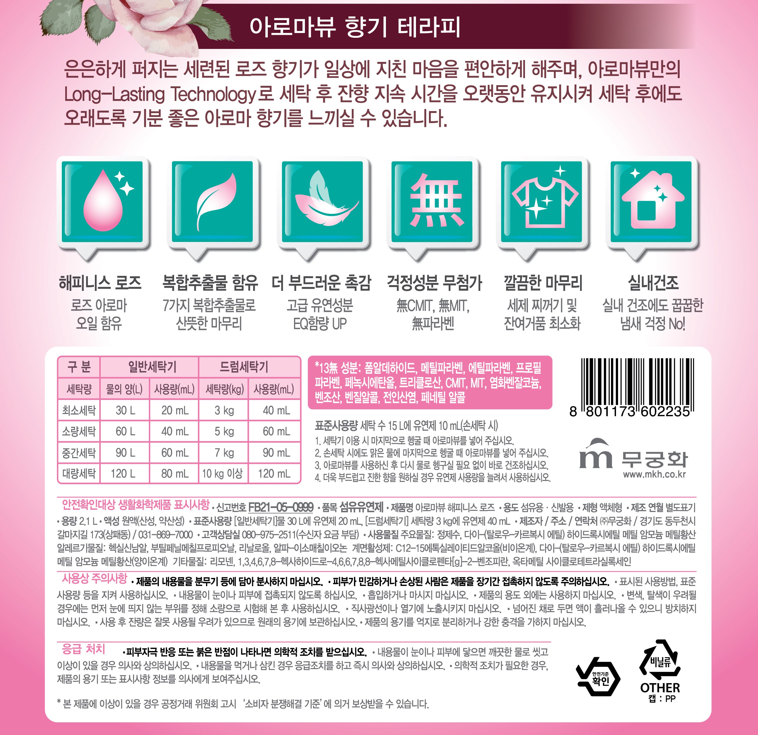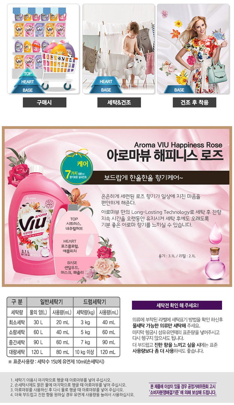 | 품목 및 제품명 | 섬유유연제 / 아로마뷰 해피니스 로즈 | 용도(표백제의 경우 계열을 함께표시) 및 제형 | 섬유용,신발용 / 비분사형-액체형 |
