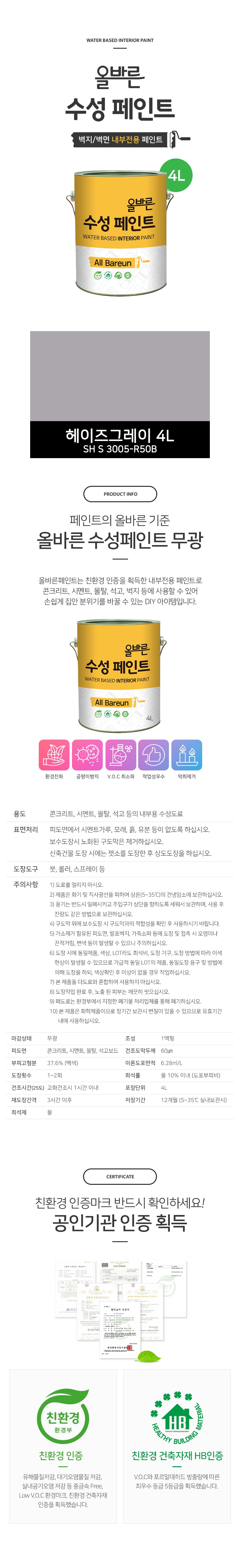 | 품명 및 모델명 | 페인트인포 올바른 수성 페인트 4L | 인증/허가 사항 | 해당사항 없음 |
