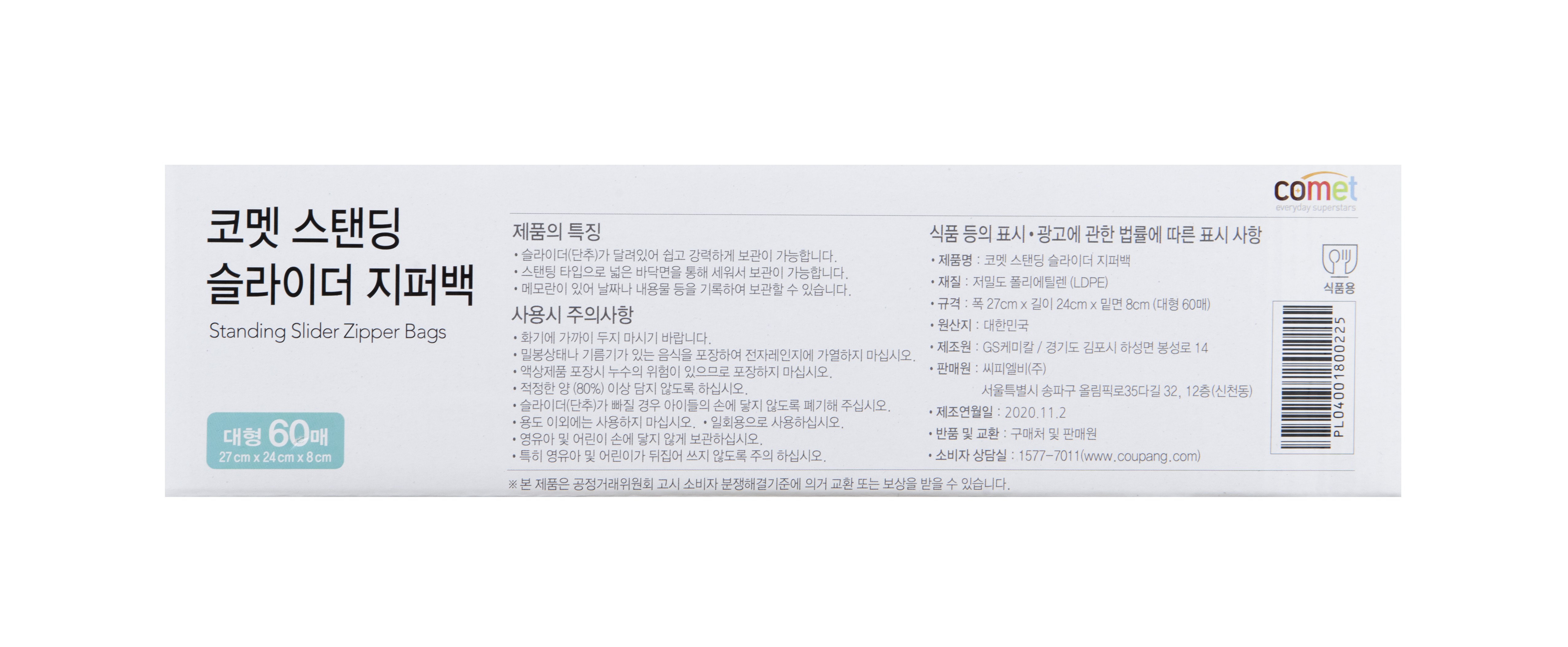 | 품명 및 모델명 | 코멧 슬라이드 스탠딩 지퍼백 대형 | 재질 | 컨텐츠 참조 |