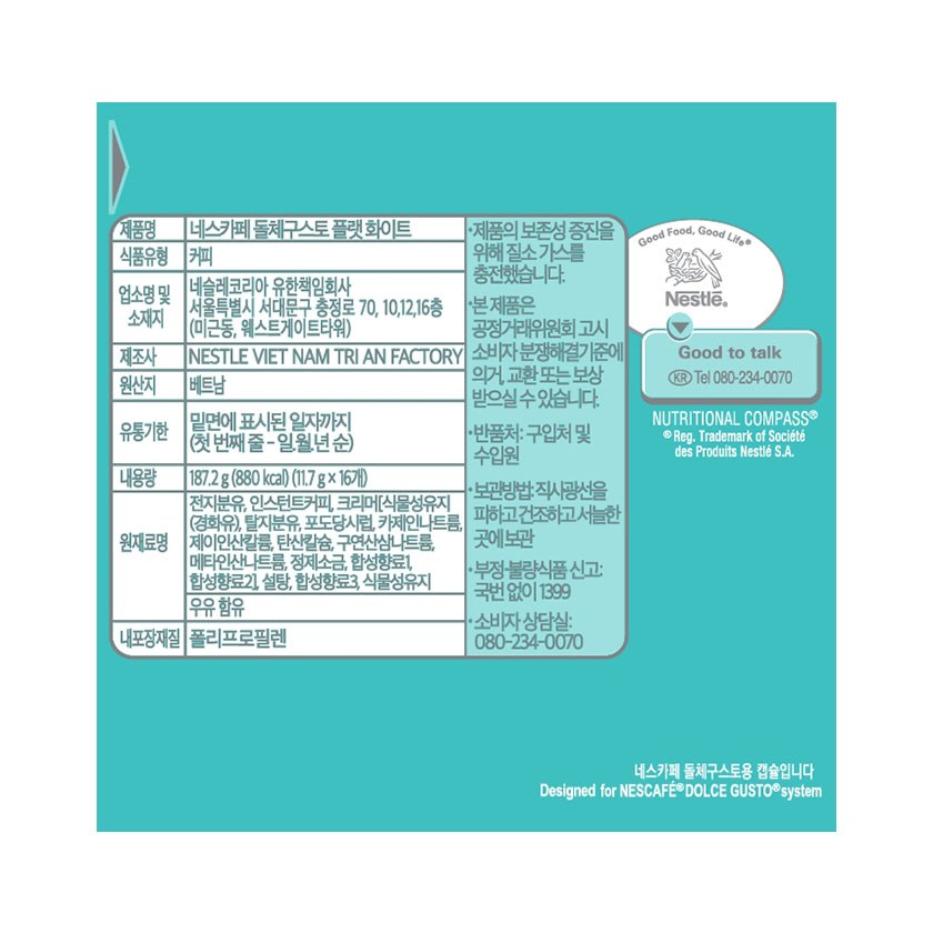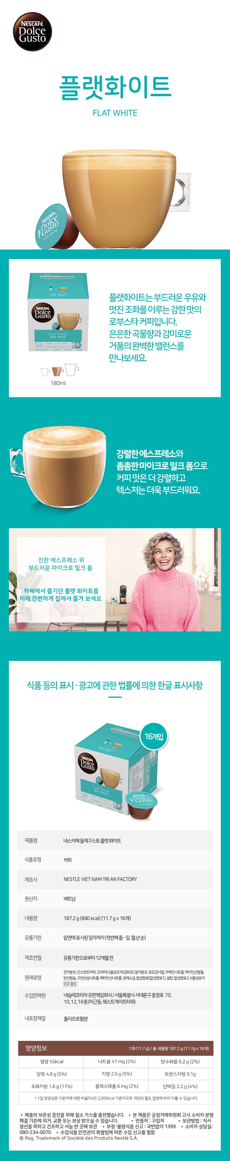 | 제품명 | 네스카페 돌체구스토 플랫 화이트 | 식품의 유형 | 컨텐츠 참조 |