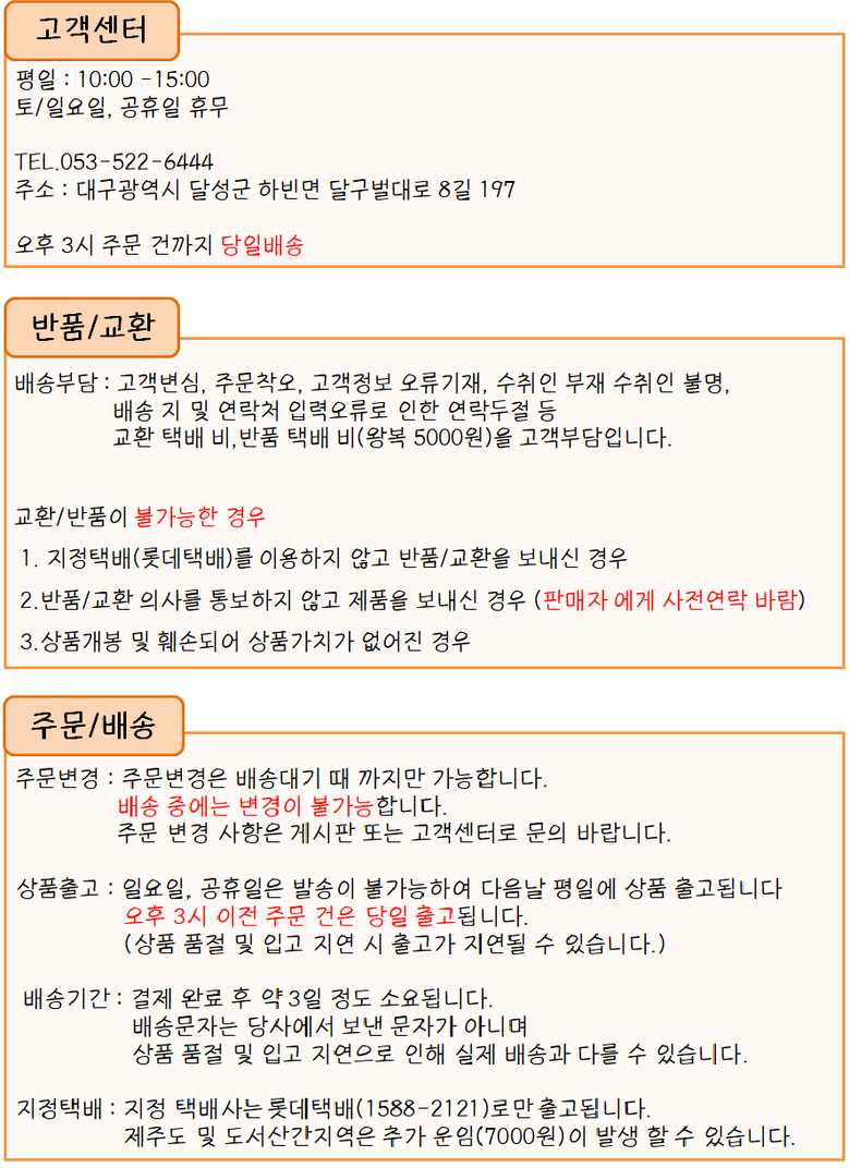 - ㆍ교환/반품에 관한 일반적인 사항은 판매자가 제시사항보다 관계법령이 우선합니다.