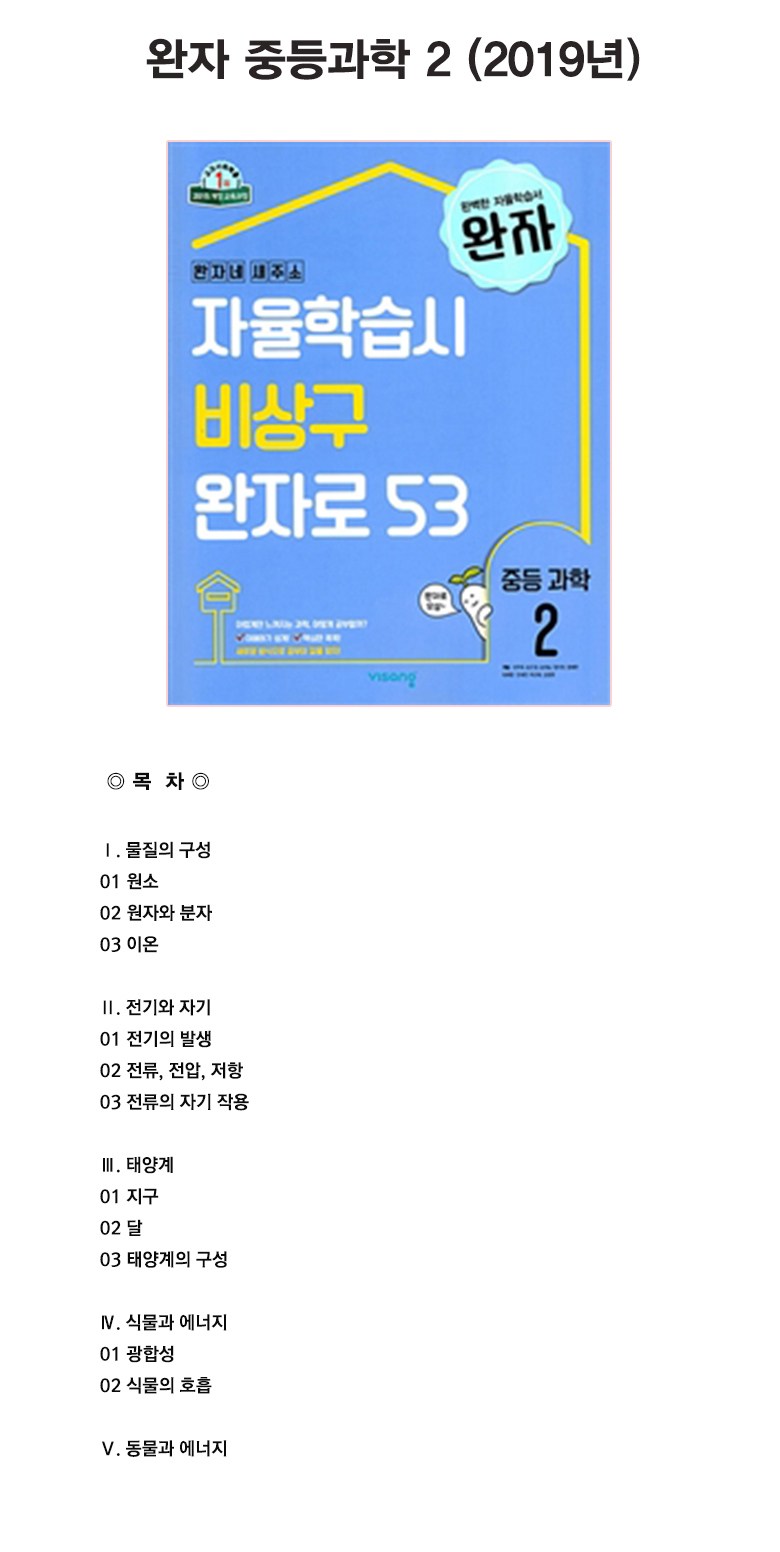 | 도서명 | 2024 완자 중등 과학 2 | 저자, 출판사 | 비상교육 편집부 저 | 비상교육 |